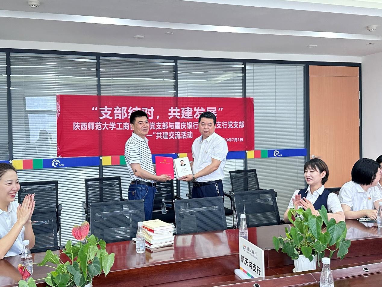随后,工商管理系党支部与重庆银行航天城支行党支部进行了座谈交流,双方互相介绍了各自单位的基本情况,并就公司办学特色、银行管理经验等业务问题进行了充分交流和探讨。