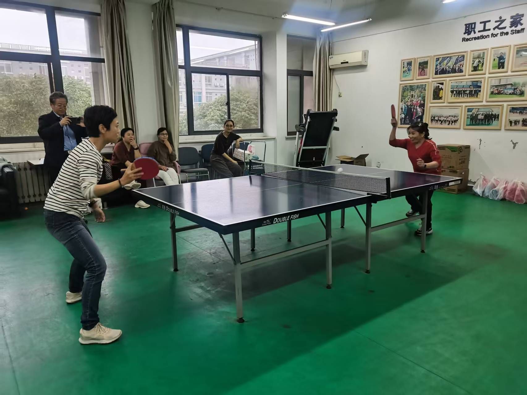 比赛采用“选拔赛+趣味性”的赛制设计:单打项目(男单、女单)通过小组循环赛与淘汰赛结合的方式决出胜负,既保证公平性,又增强竞技性。赛场上,选手们身姿矫健,直拍、横拍、扣杀、推挡等技巧轮番上演,欢呼声与喝彩声此起彼伏;场下,教职工们互相加油鼓劲,充分展现了“友谊第一、比赛第二”的体育精神。